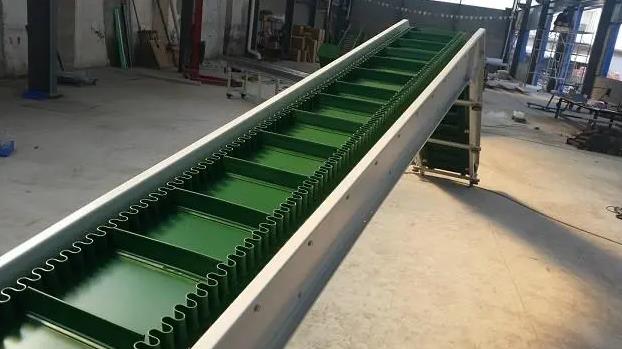 1、带裙边的输送皮带:裙边皮带输送机的输送带的结构形式为中间低的平面皮带辅以两边高的类似裙边的橡胶带组合而成,这种设计,能够较好的防止物料洒落;其平面皮带上,通常在一定的间距会有一定高度的橡胶挡板,这种结构能够很好的将物料输送到较高位置。